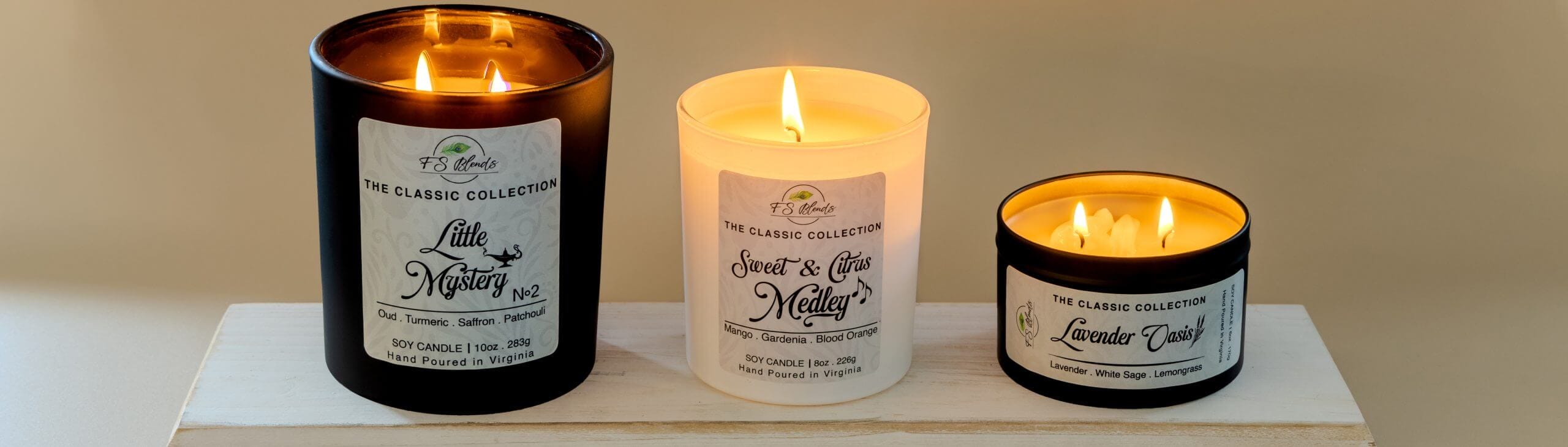The Classic Collection Candles features timeless and classic fragrances that can be enjoyed all year round. Each candle has been carefully crafted with a unique blend of high quality fragrances and creative names adding a personal touch to the overall experience. Our collection comes in two Classy colors, Black and white Jars and tins. Available in three different sizes making it an easy fit for any setting. If you are looking to create a fresh, inviting, cozy, romantic, relaxing, mystic or nostalgic atmosphere in your ambience, this collection allows you to choose the perfect scented candle .